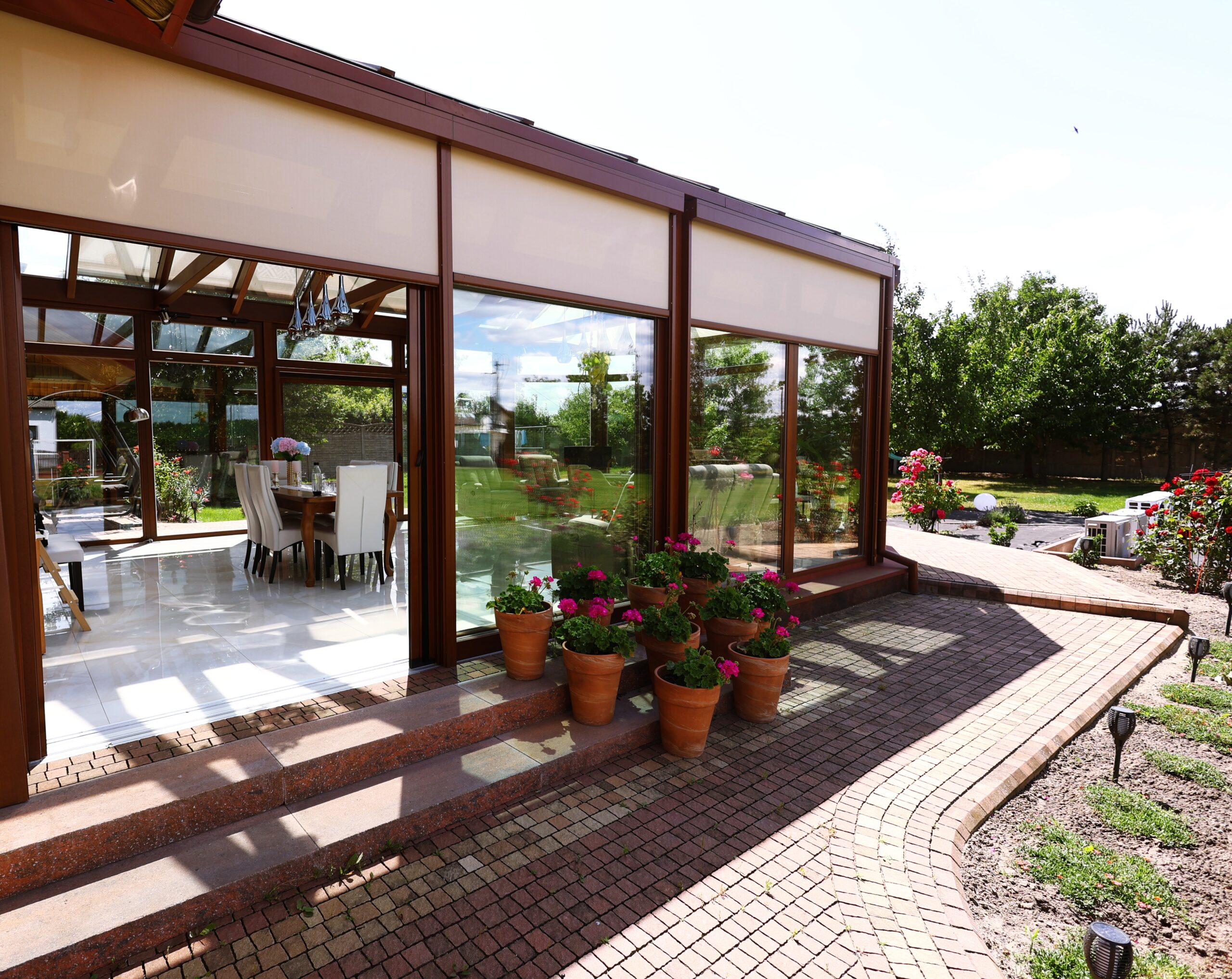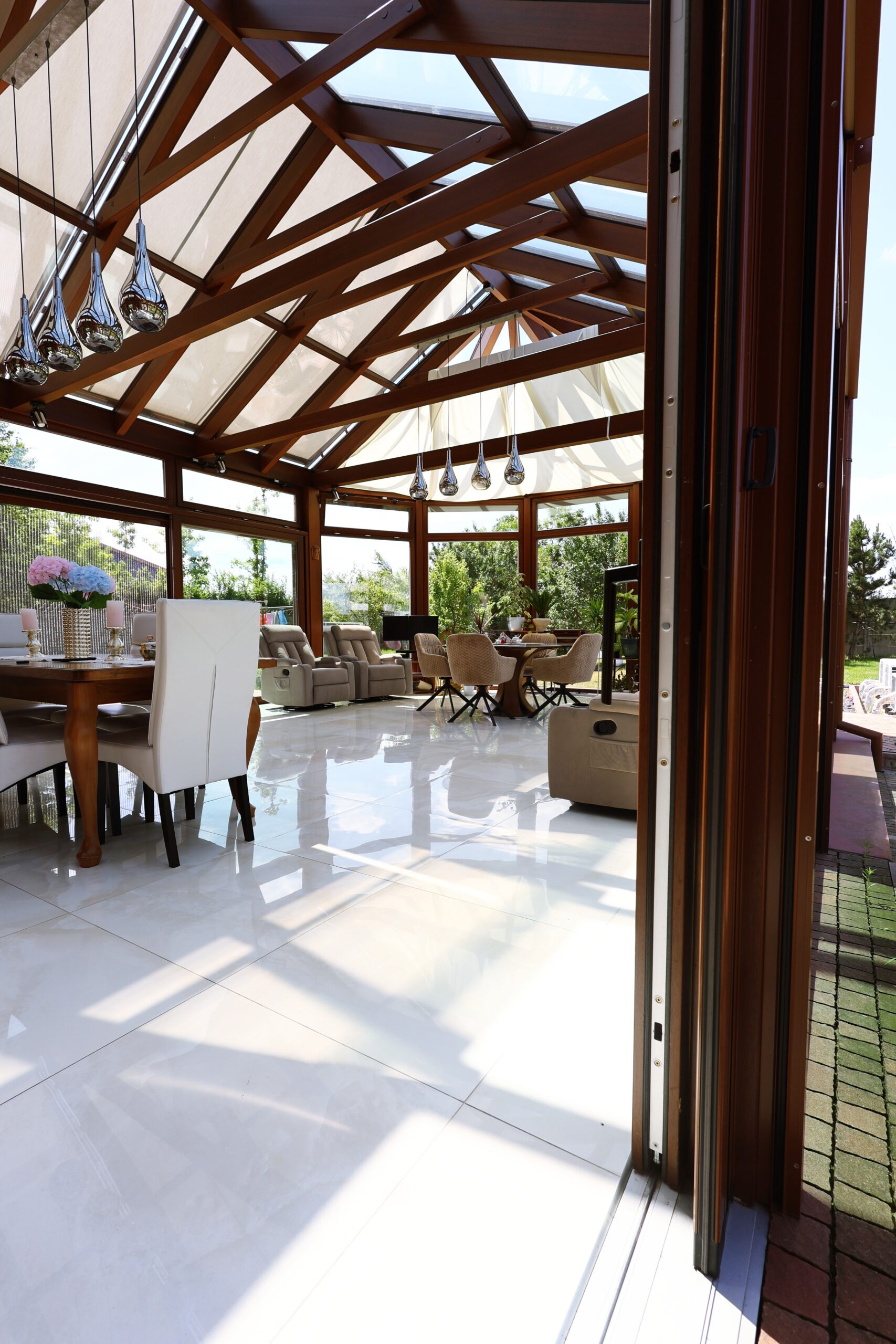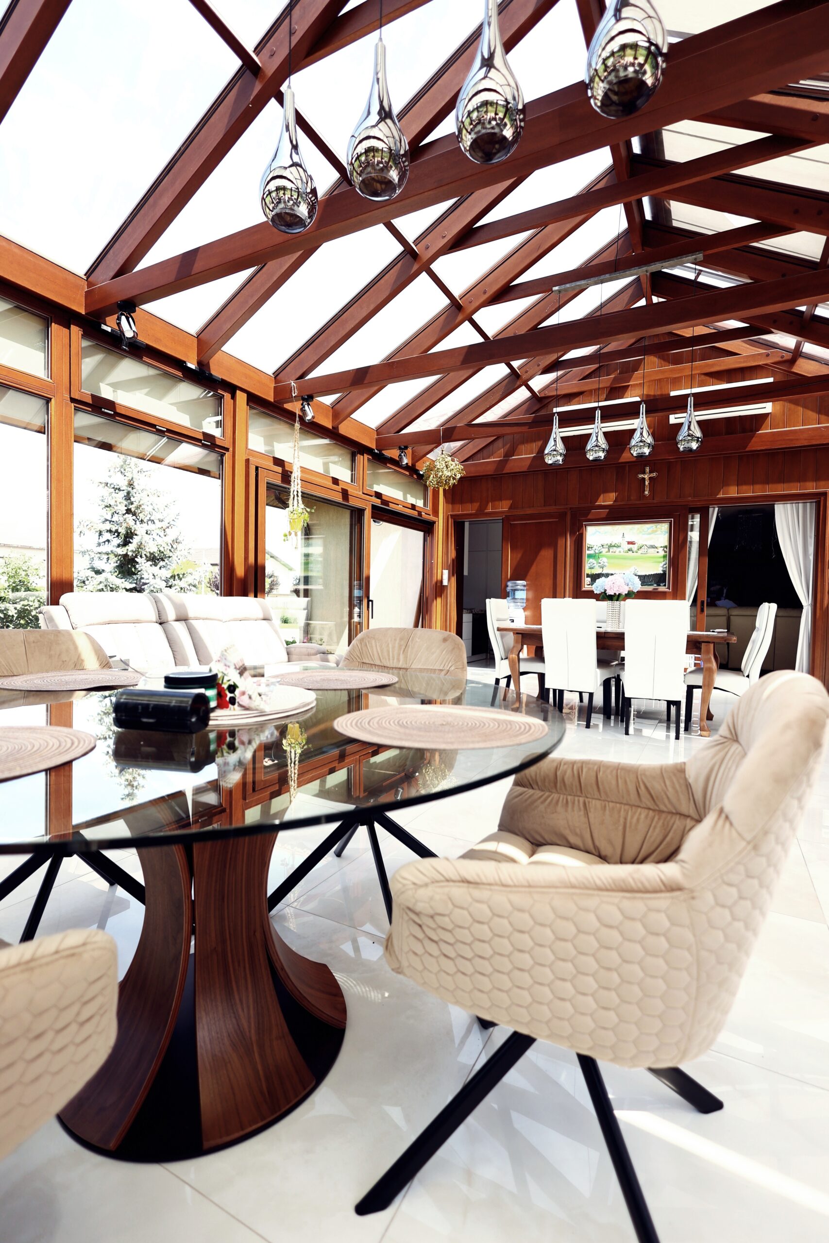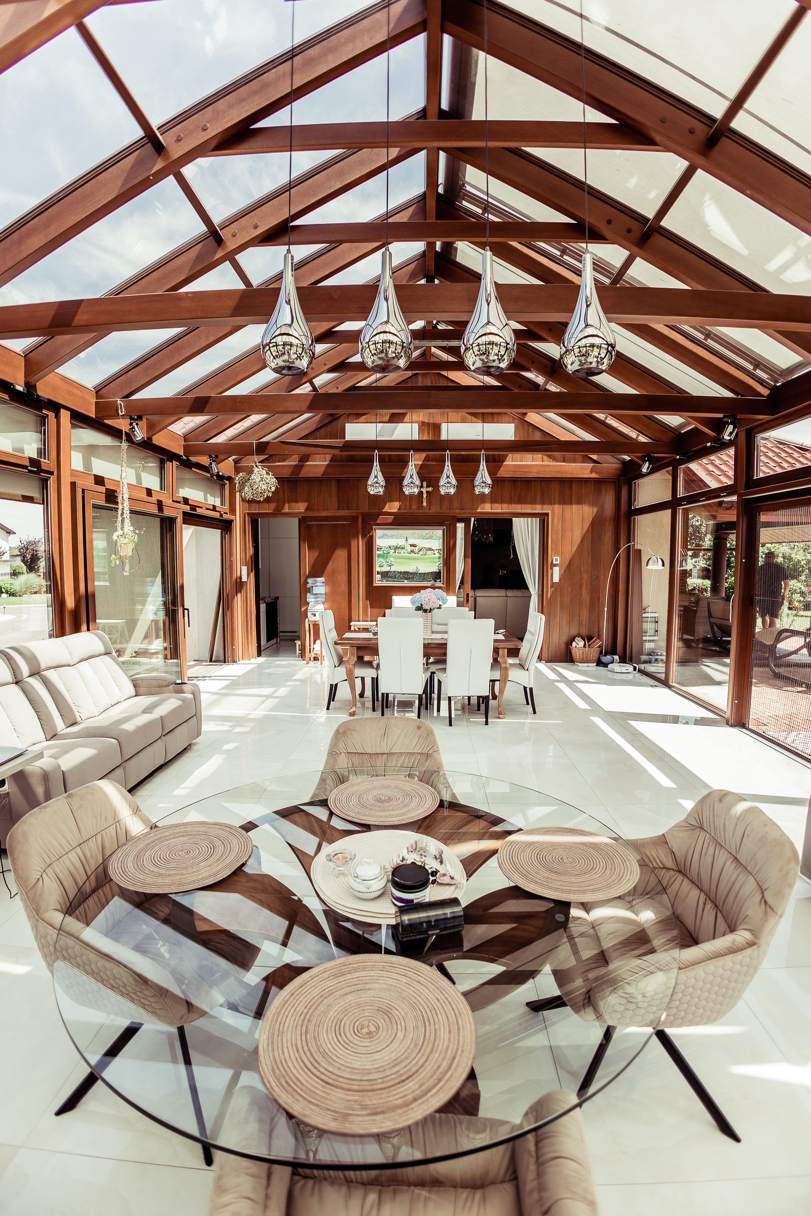 Przytulny, a jednocześnie elegancki ogród zimowy, który idealnie łączy dom z otaczającym ogrodem. Duże przeszklenia wypełniają wnętrze naturalnym światłem, a ciepły odcień drewna tworzy wyjątkową, spokojną atmosferę. To miejsce, w którym można cieszyć się poranną kawą, popołudniowym słońcem lub długimi wieczorami w gronie najbliższych. Naturalne materiały i staranne wykończenie sprawiają, że przestrzeń ta harmonijnie wpisuje się w charakter całego domu, dodając mu przytulności i klasy.