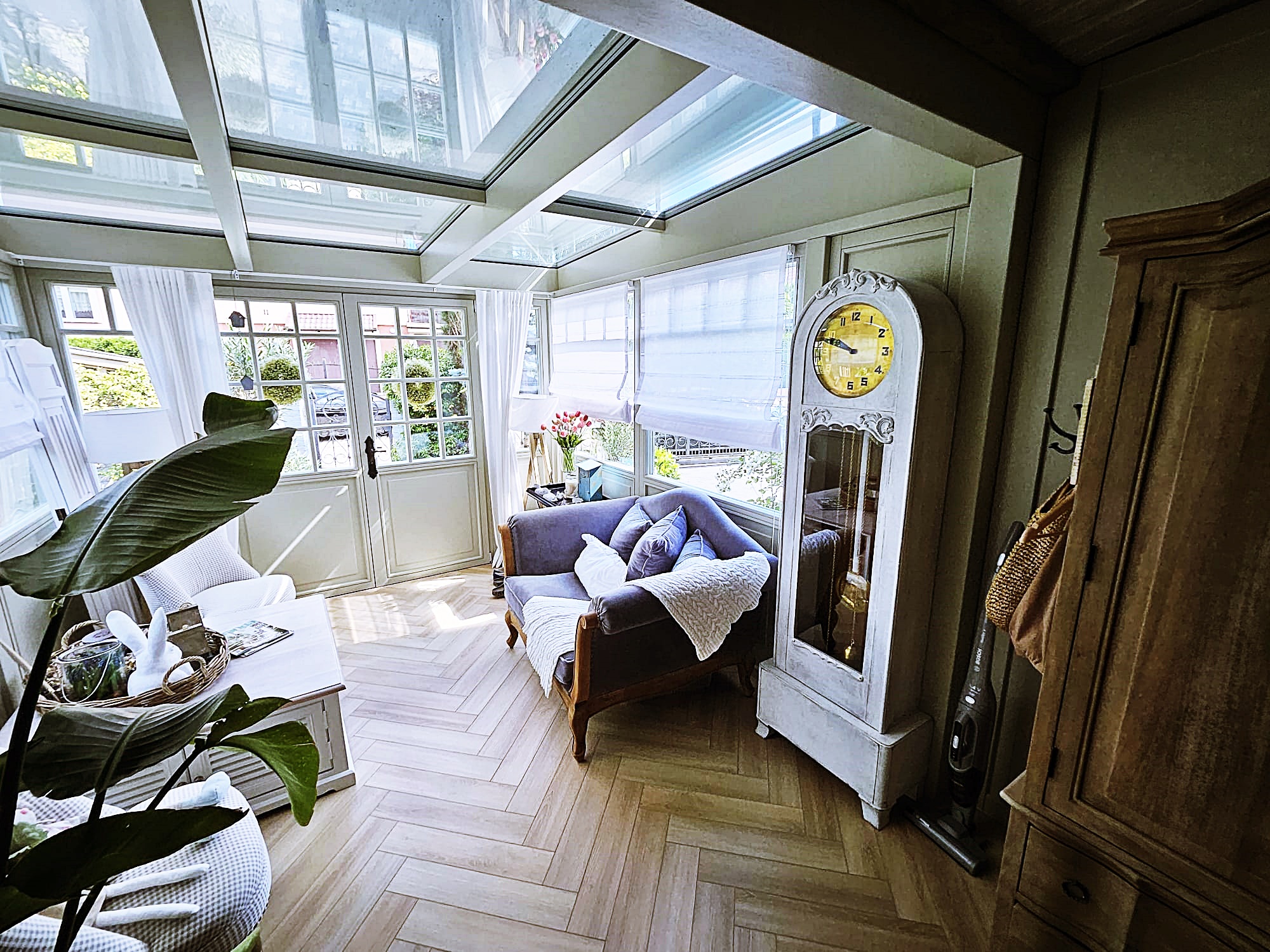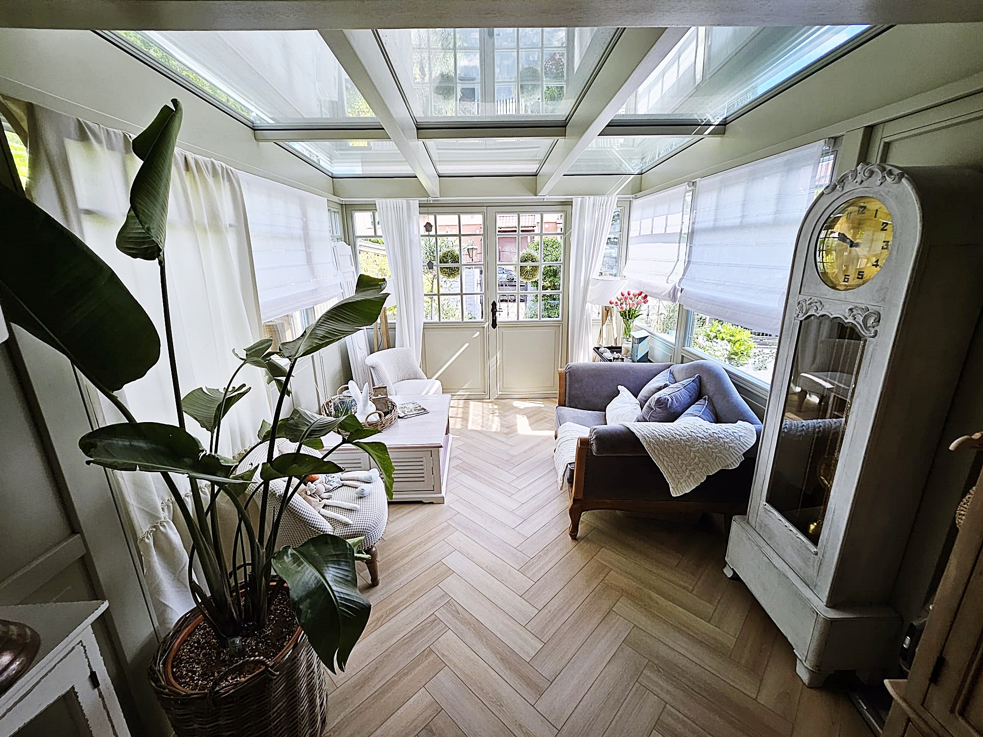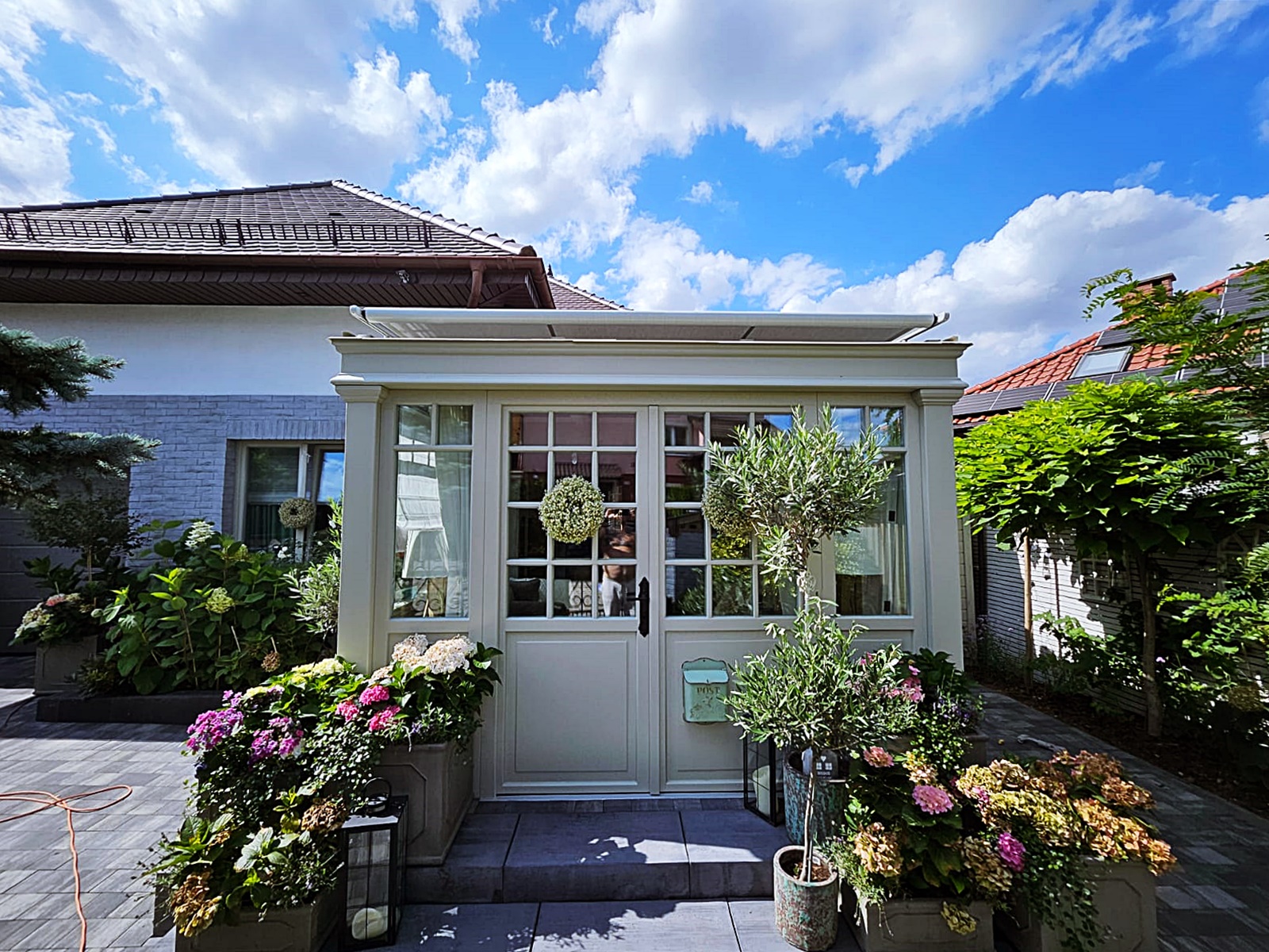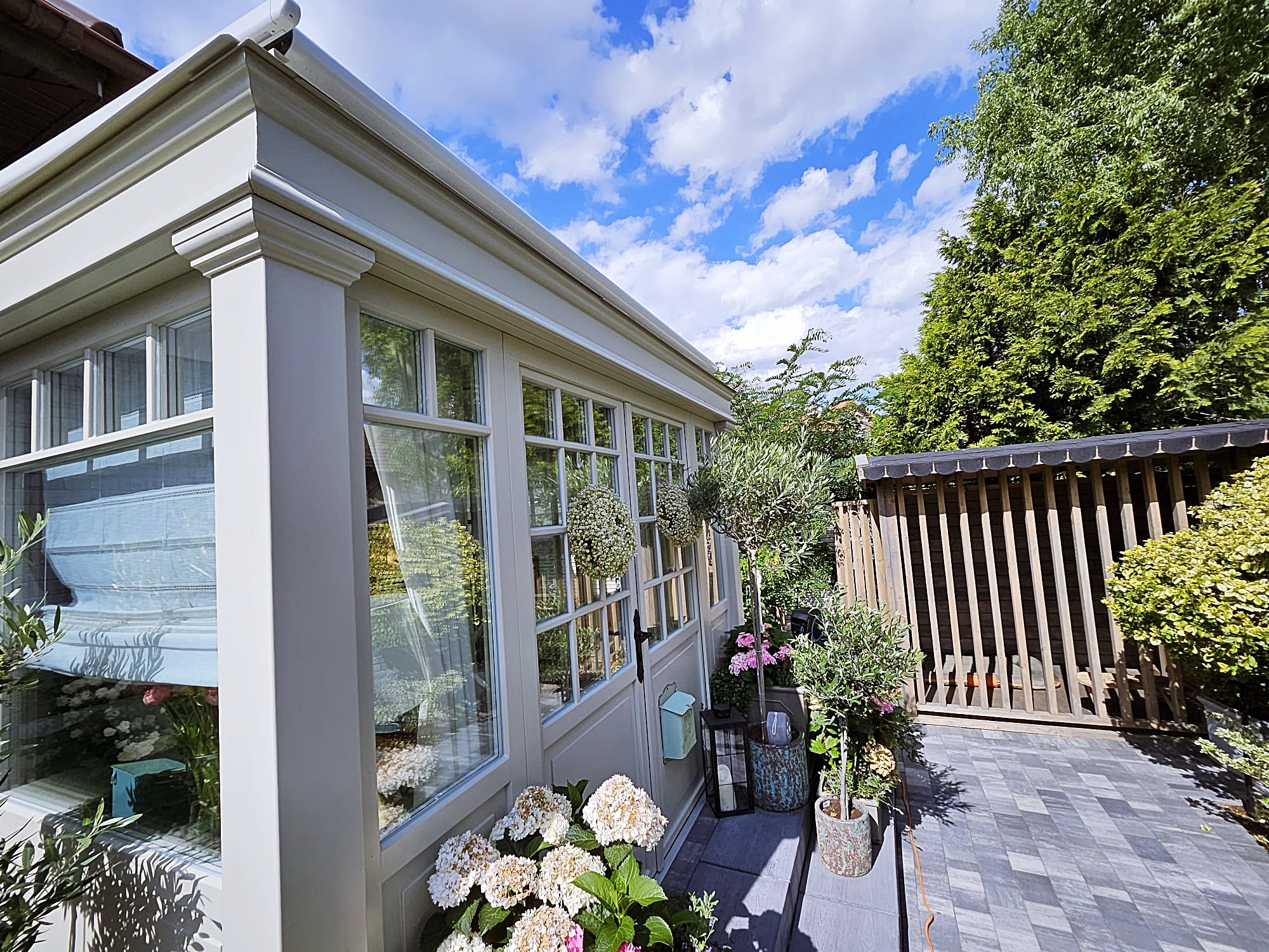 Ogród zimowy całoroczny wykonany w egzotycznym drewnie meranti malowany z palety kolorów RAL wybranych przez klienta. Zaprojektowany w klasycznym stylu angielskim, jest elegancką i funkcjonalną przestrzenią, która dodaje wartości i uroku każdej nieruchomości. Styl angielski charakteryzuje się symetrią, eleganckimi detalami i klasycznymi liniami, co tworzy harmonijną i przytulną atmosferę. W ogrodzie wykorzystano zintegrowane systemy zaciemniające, takie jak zewnętrzne rolety dachowe chroniące przed nadmiernym nasłonecznieniem.