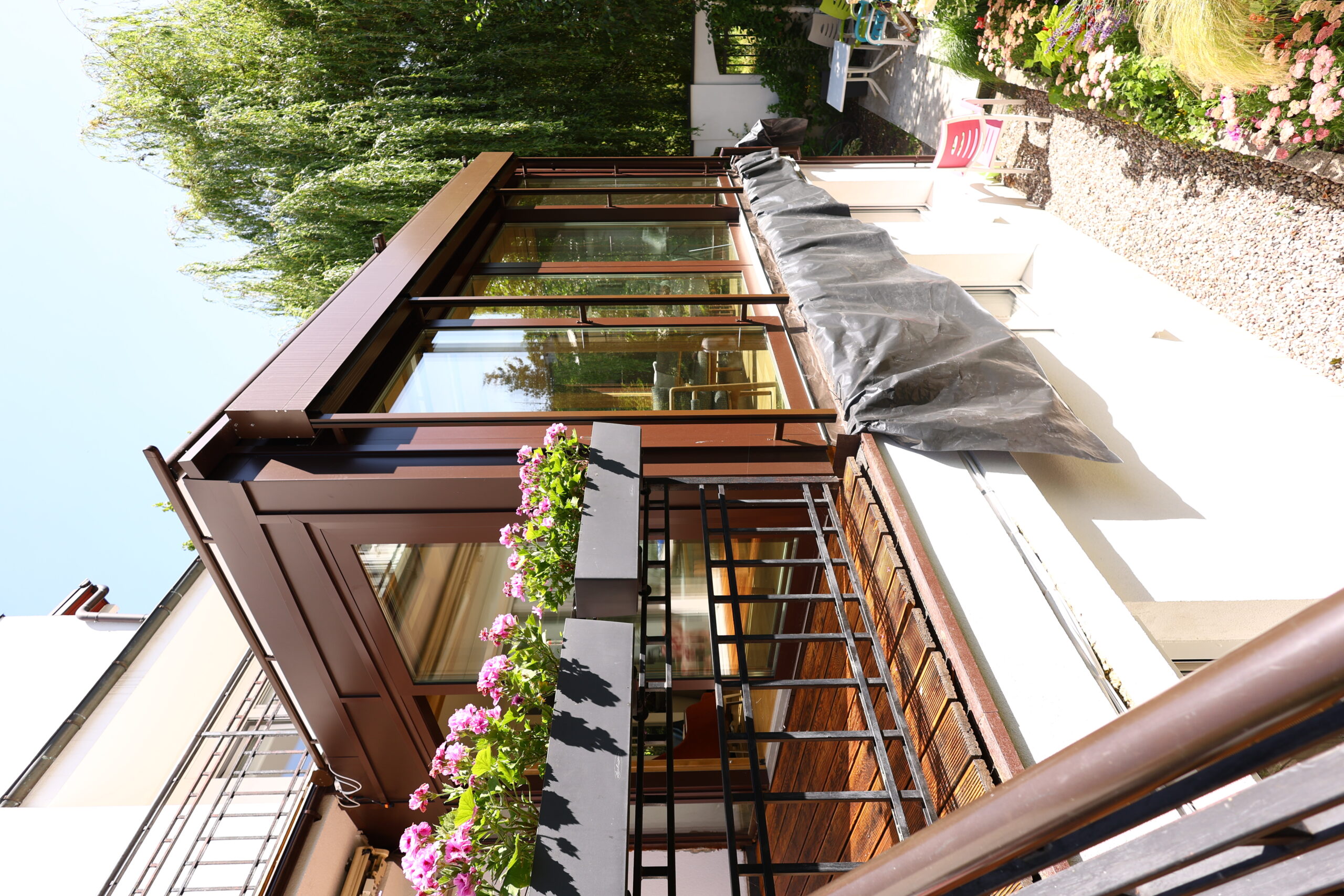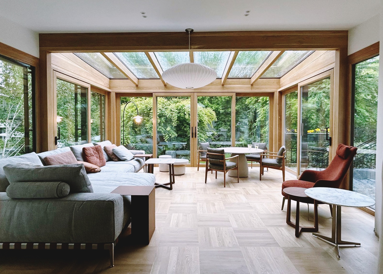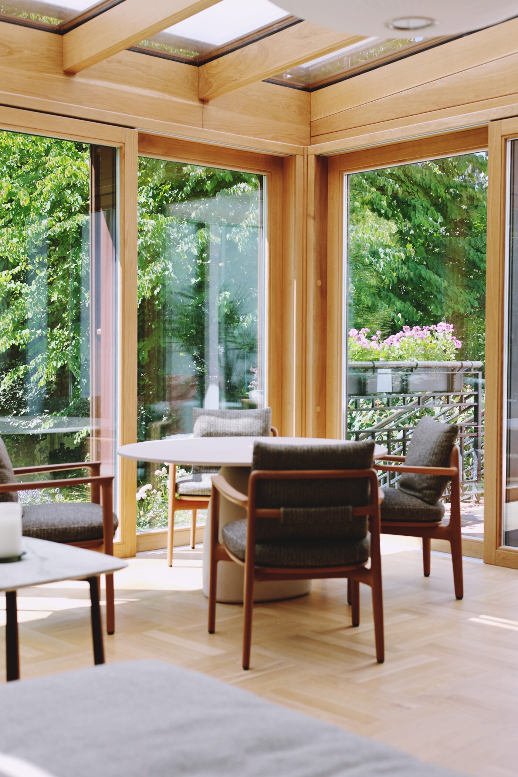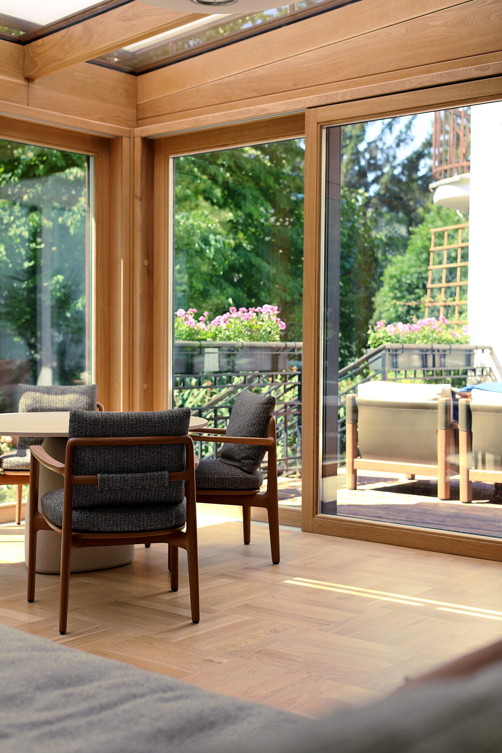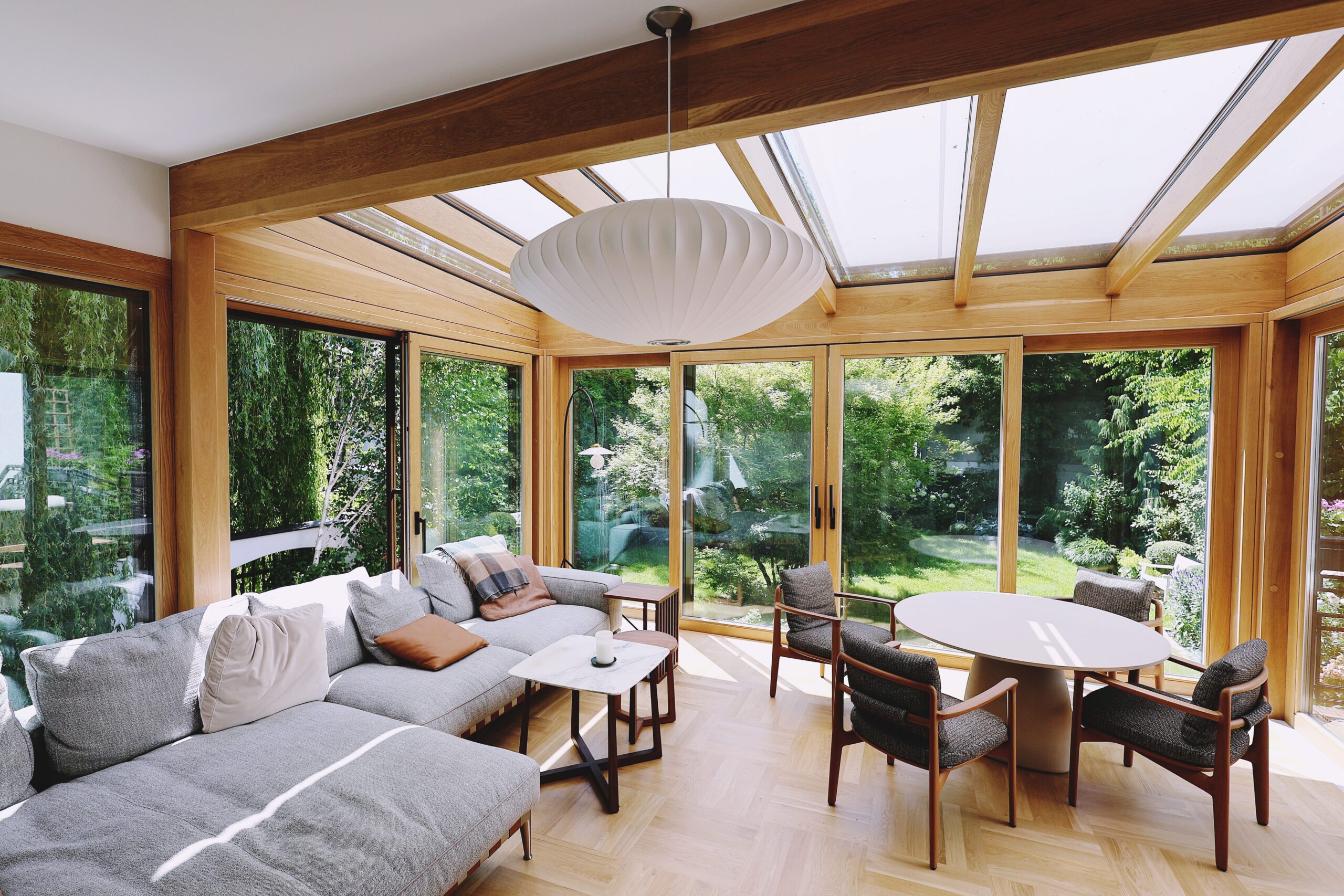 Ten elegancki ogród całoroczny wykonany w ciepłym odcieniu naturalnego dębu to idealne połączenie nowoczesnego designu i ponadczasowej estetyki. Przestrzeń została zaprojektowana jako przytulny salon, w którym natura przenika do wnętrza dzięki dużym przeszkleniom i panoramicznym drzwiom przesuwnym.