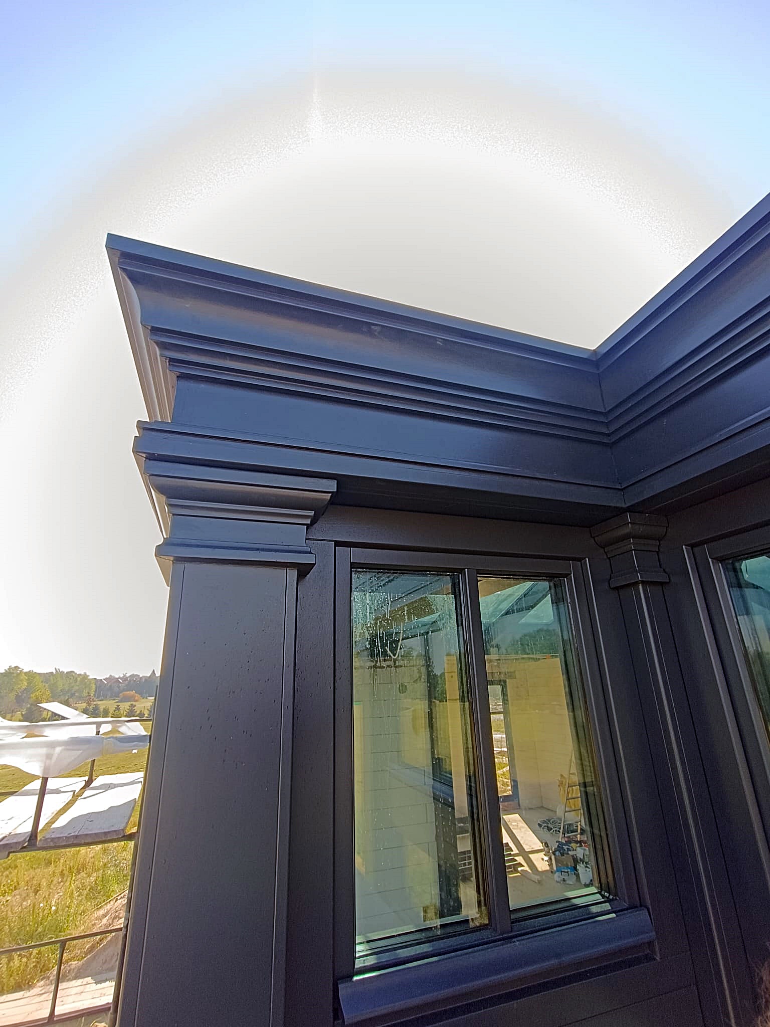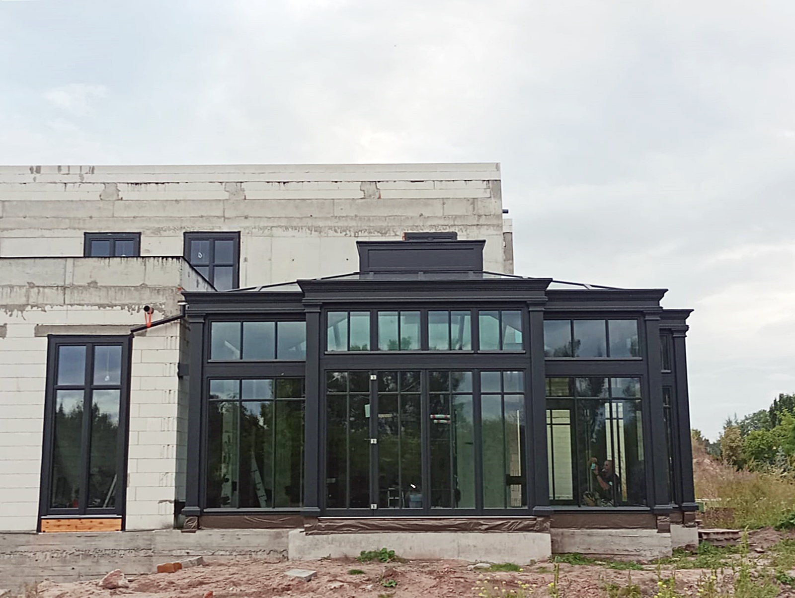 Zdobienia: gzymsy i frezy są wykonane z najwyższą starannością, co nadaje ogrodowi zimowemu wyjątkowy charakter. Elementy te są zaprojektowane z myślą o harmonijnym współgraniu z całością budynku.