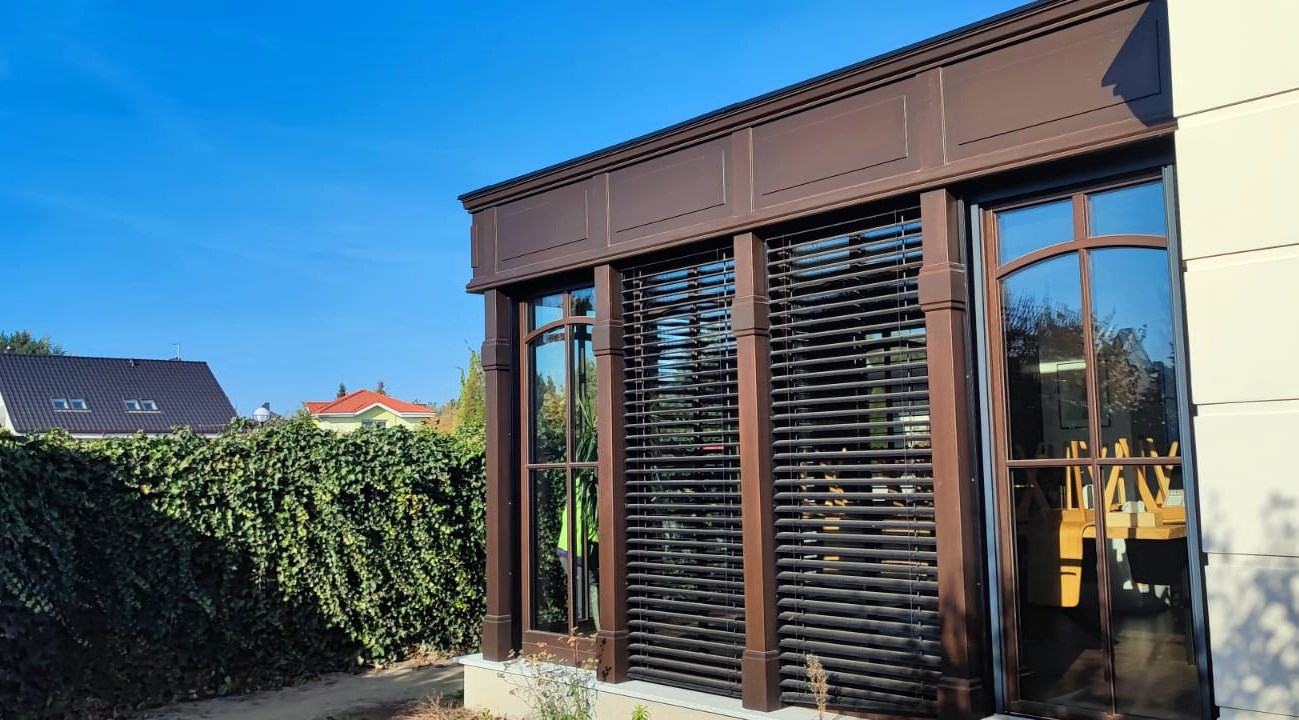 Ogród zimowy doskonale komponuje się z klasyczną i nowoczesną architekturą, stanowiąc eleganckie dopełnienie każdej posesji. Solidne żaluzje zewnętrzne nie tylko dodają estetyki, ale również dbają o prywatność i regulację nasłonecznienia.