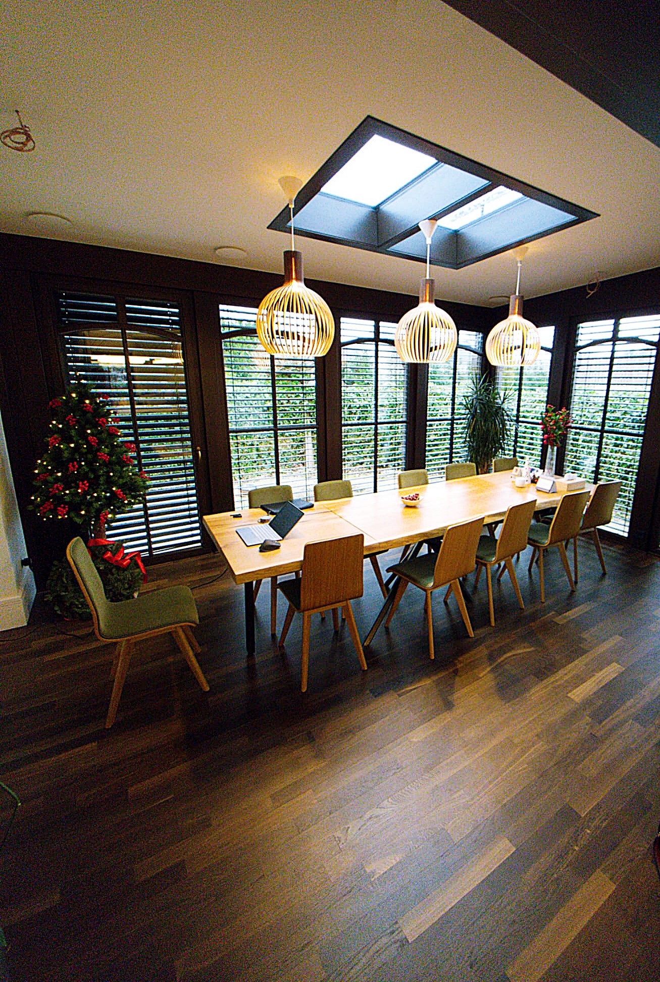 Ciepły odcień drewna i tradycyjne detale tworzą atmosferę klasycznej elegancji, a przeszklenia umożliwiają maksymalne wykorzystanie naturalnego światła. Dodatkowo, świetliki w dachu wprowadzają więcej dziennego światła, podkreślając przestronność pomieszczenia.