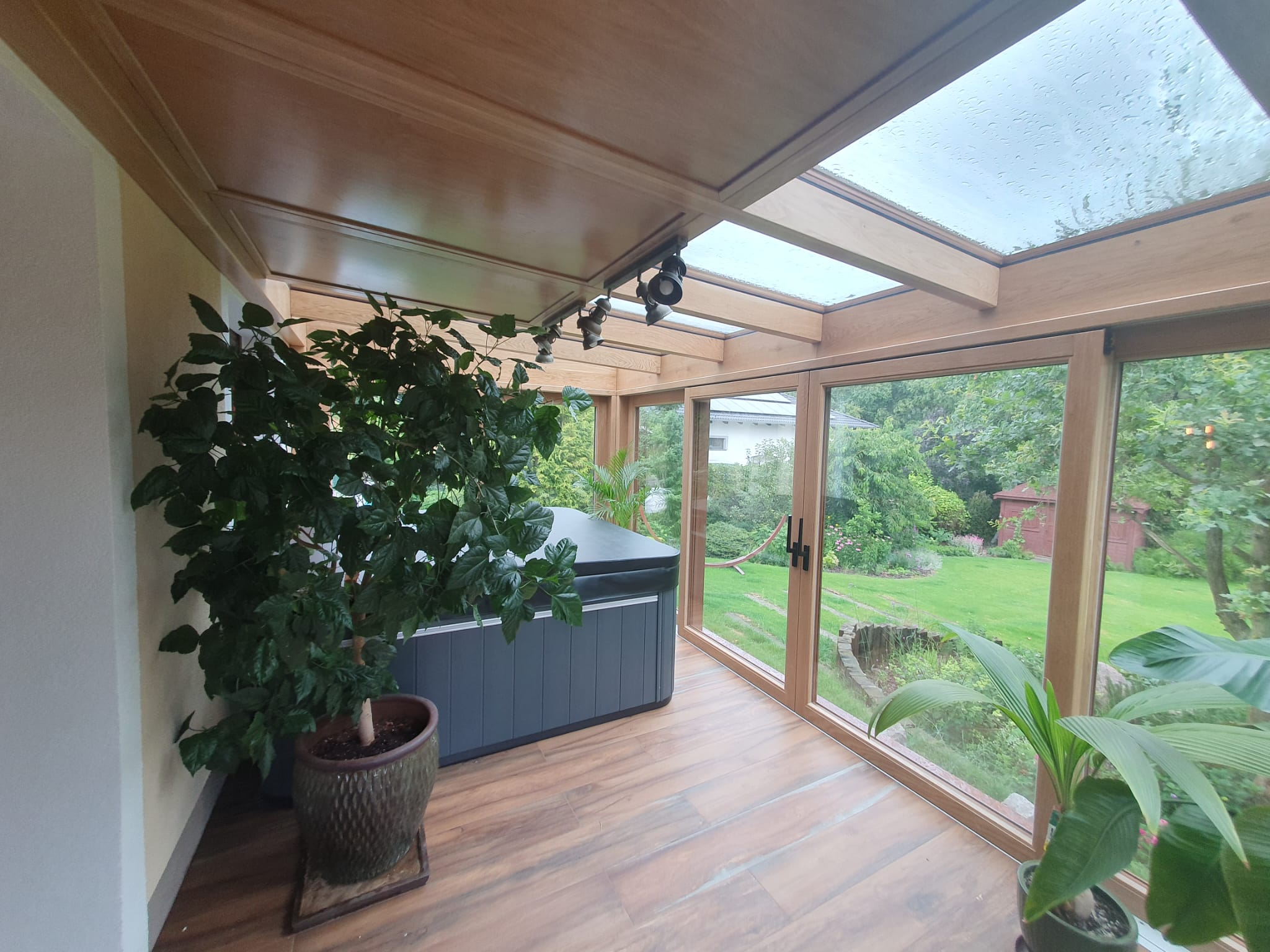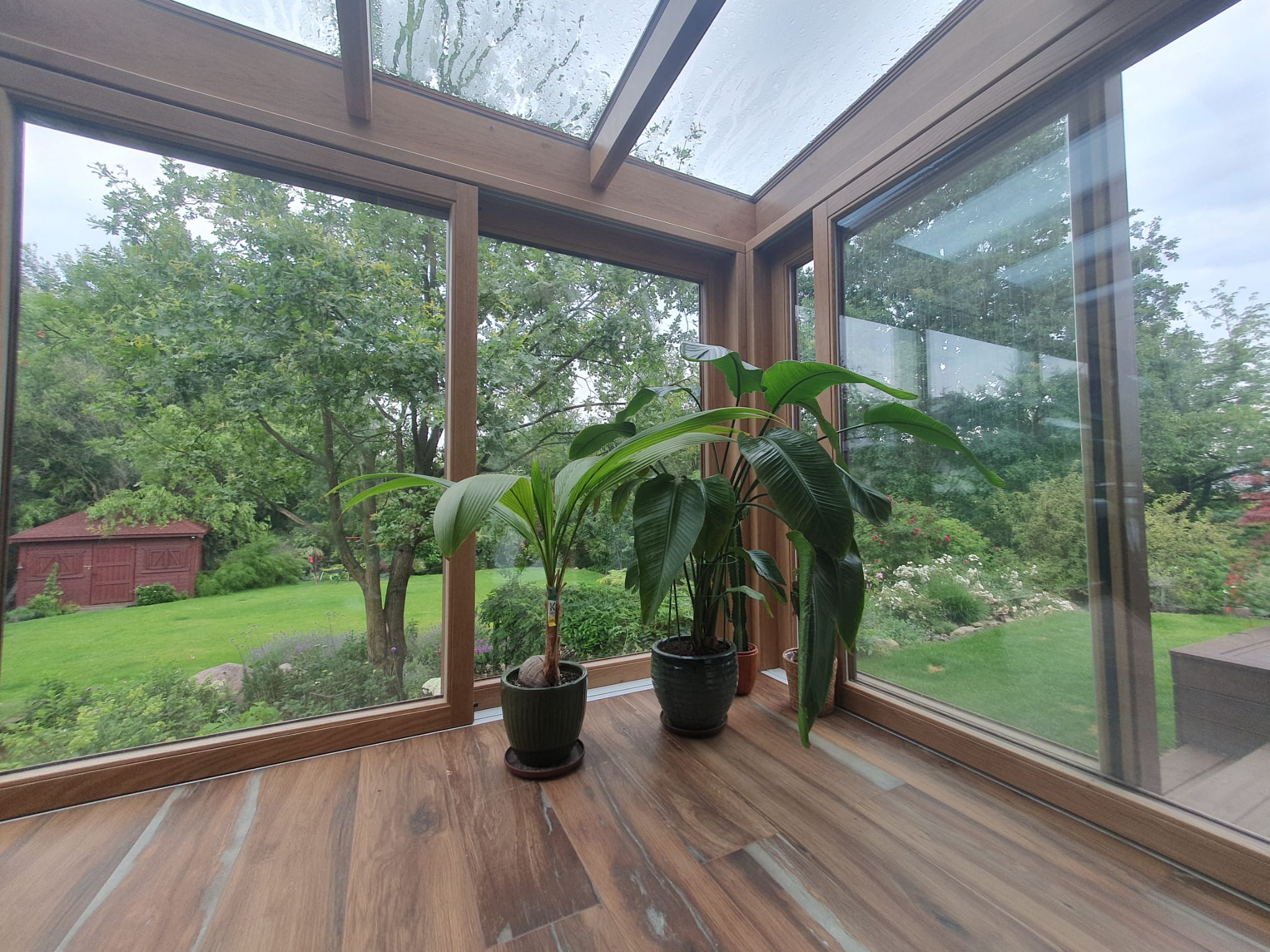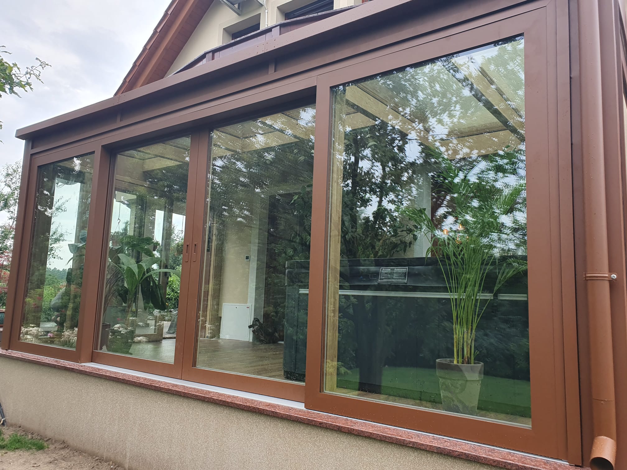 Ogród zimowy wykonany w konstrukcji drewniano-aluminiowej, z wykorzystaniem drewna dębowego, został wyposażony w przesuwne okna typu HS. Konstrukcja łączy w sobie elegancję i ciepło drewna (wewnątrz) z trwałością i odpornością na warunki atmosferyczne aluminium (zewnątrz). Tego typu rozwiązanie zapewnia estetyczny wygląd, dobrą izolację termiczną oraz wytrzymałość, dzięki czemu ogród zimowy można użytkować przez cały rok. System przesuwny zapewnia łatwe otwieranie dużych przeszkleń, umożliwiając płynne połączenie wnętrza z ogrodem.